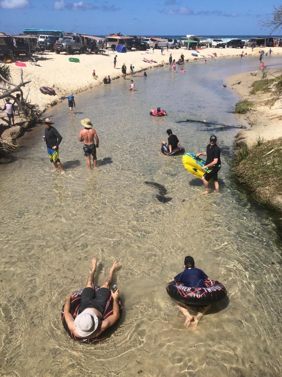 Was er nicht ganz so lustig fand, war unser Platten. Da wir im absoluten Nirgendwo im Dschungel gestrandet waren, mussten die Männer an Bord wohl oder übel den Reifen eigenständig wechseln. Wir Ladys haben sie natürlich aus Leibeskräften angefeuert 😉 (nach einer guten halben Stunde Rekordzeit!!) waren wir reif für eine Pause im Lake McKenzie. Ich habe noch nie im Leben einen so klaren See gesehen! Köpfer rein und genießen! Es gibt einige fresh water Seen auf Fraser Island, die sich alleine vom regelmäßigen Regen nähren. Sehr beeindruckend, was die Natur da wieder zaubert!