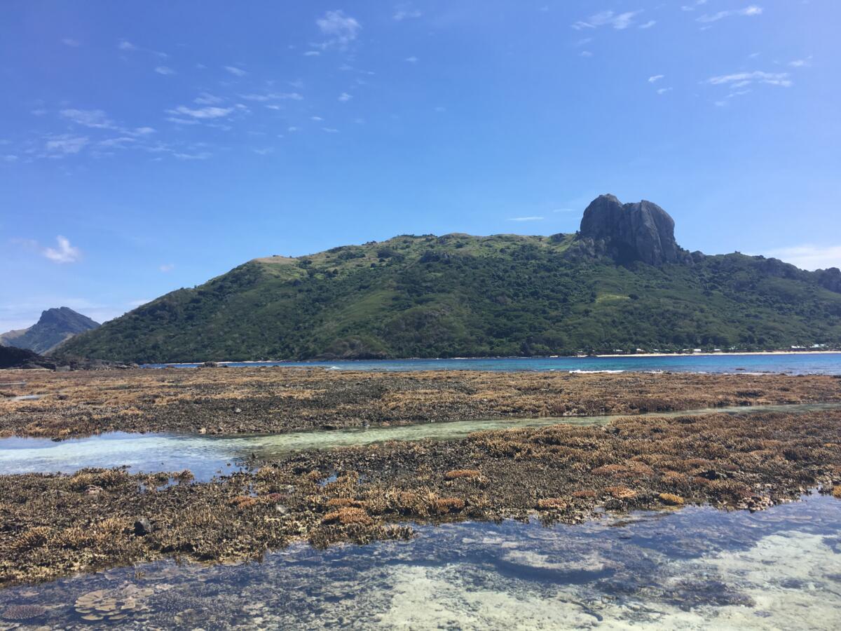 Bula (hallo)! Meine erste Insel, auf der ich auch tauchen werde. Ich werde mit einem kleinen Boot dorthin gebracht und wir fahren direkt durch die Korallen-Wälder. Bei Ebbe sind diese nämlich sichtbar. Ich bin ziemlich geflahst, weil nachmittags sind die Korallen-Bänke wieder komplett unter Wasser und ich kann darüber schnorcheln.